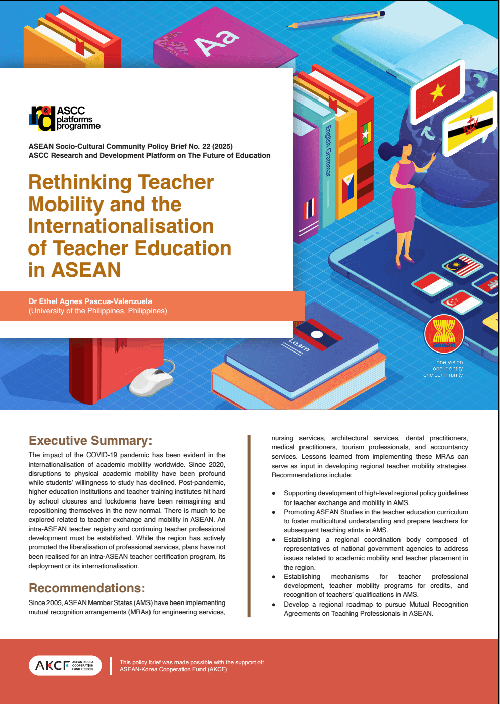 Policy Briefs Facts & Figures ASCC R&D Explainers Impact Stories Highlights Publications Explore ASEAN website The ASEAN magazine ADME Facts & Figures ASCC R&D Explainers Impact Stories Highlights Publications Explore ASEAN website The ASEAN magazine ADME Policy Briefs All categoriesCulture and ArtsDemographyDisaster ManagementEducationEnvironmentGender Equality and Women EmpowermentHealthInformation and MediaLabour & Civil ServiceRural Development and Poverty EradicationSocial Welfare and DevelopmentYouth datea-z Policy Brief Rethinking Teacher Mobility and the Internationalisation of Teacher Education in ASEAN 22 January 2026 Education Policy Brief Beyond Technology: Gender Inequality and Challenges to Financial inclusion in ASEAN 27 August 2025 Rural Development and Poverty Eradication, Social Welfare and Development Policy Brief Women Leadership and Its Contribution to Poverty Eradication in Rural Coastal Area 27 August 2025 Rural Development and Poverty Eradication, Social Welfare and Development Policy Brief Urbanisation and Gentrification: Addressing Poverty in ASEAN Cities 27 August 2025 Rural Development and Poverty Eradication, Social Welfare and Development Policy Brief Driving Inclusive and Sustainable Digital Transformation: Managing the Risks of Financial Technology Misuse Among Low-Income and Vulnarable Communities in ASEAN 27 August 2025 Rural Development and Poverty Eradication, Social Welfare and Development Policy Brief Strengthnening Governance of Employment Outsourcing for Decent Work 31 July 2025 Labour & Civil Service 12...6